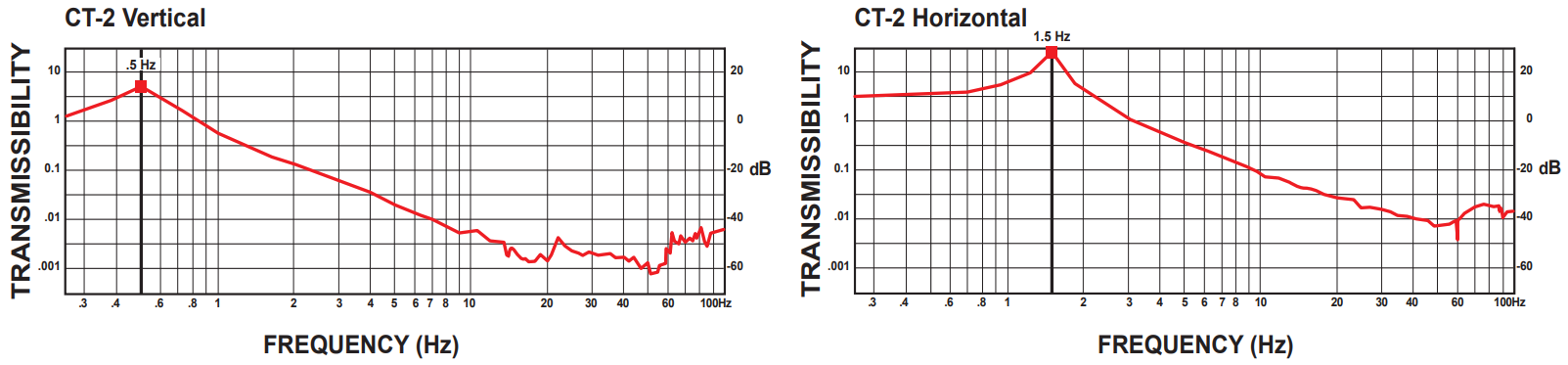 垂直方向上,其固有頻率在整個(gè)負(fù)載范圍內(nèi)都可調(diào)節(jié)至 0.5 Hz,能有效抑制垂直方向的振動(dòng)干擾。下方的垂直性能曲線能直觀地展示其在 0.5 Hz 時(shí)的優(yōu)異隔振效果。水平方向上,CT-2 的固有頻率與負(fù)載重量相關(guān),在負(fù)載接近上限時(shí)可實(shí)現(xiàn)約 1.5 Hz 的水平頻率,當(dāng)負(fù)載較小時(shí),水平頻率會(huì)相應(yīng)升高,但即便如此,其水平隔振性能仍遠(yuǎn)超普通空氣隔振臺(tái)。