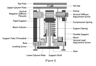 下圖為負剛度隔振平臺的結構圖,合并了垂直以及水平方向的隔振器,一塊橡膠可傾瓦作為傾斜隔振器。 垂直剛度調(diào)節(jié)螺釘用于調(diào)節(jié)負剛度結構中片彈簧上的壓力,從而改變垂直剛度。垂直負載調(diào)節(jié)螺通過升降支撐彈簧的底座來調(diào)整不同的重量負載,以保持片彈簧處于筆直、不彎曲的工作位置。以上特點可以使單隔振器工作,并在多隔離器系統(tǒng)中實現(xiàn)自動調(diào)平。