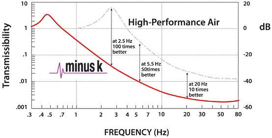 基于現(xiàn)場測試以及客戶的評估,MinusK的隔振平臺可以實現(xiàn)0.5 Hz的固有頻率,相較于市場上的高性能空氣隔振平臺,在不同的振動頻率下,隔振性能可以提高100倍。對主動隔振平臺,也具有明顯的優(yōu)勢。