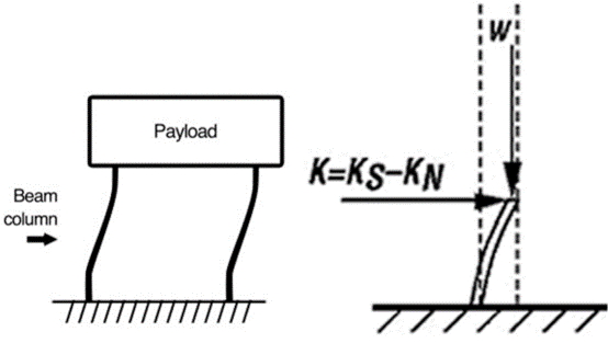 水平隔振器由兩個支桿組成,類似于兩個被負載軸向加力的底端固定頂端鉸接的梁柱,當未加負載時,梁柱具有水平剛度Ks,當增加負載時候,側彎剛度由于梁柱效應而減小。