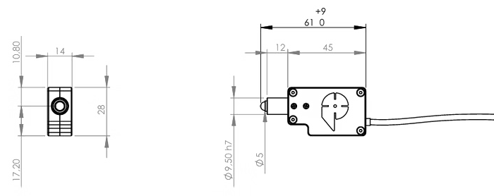 該壓電推桿尺寸為 67 × 28 mm,行程為 9 mm,推力為 10 N。